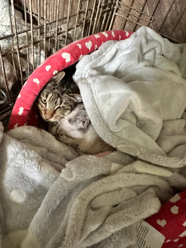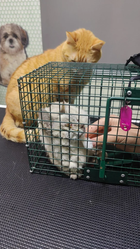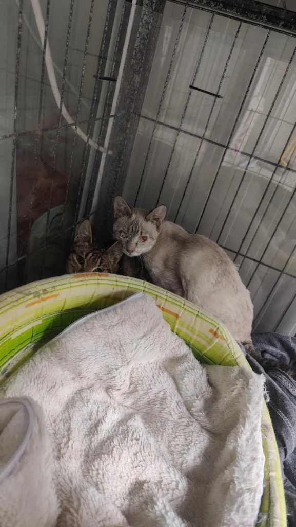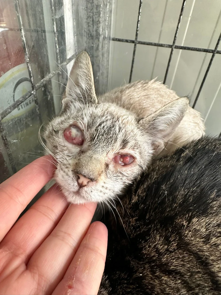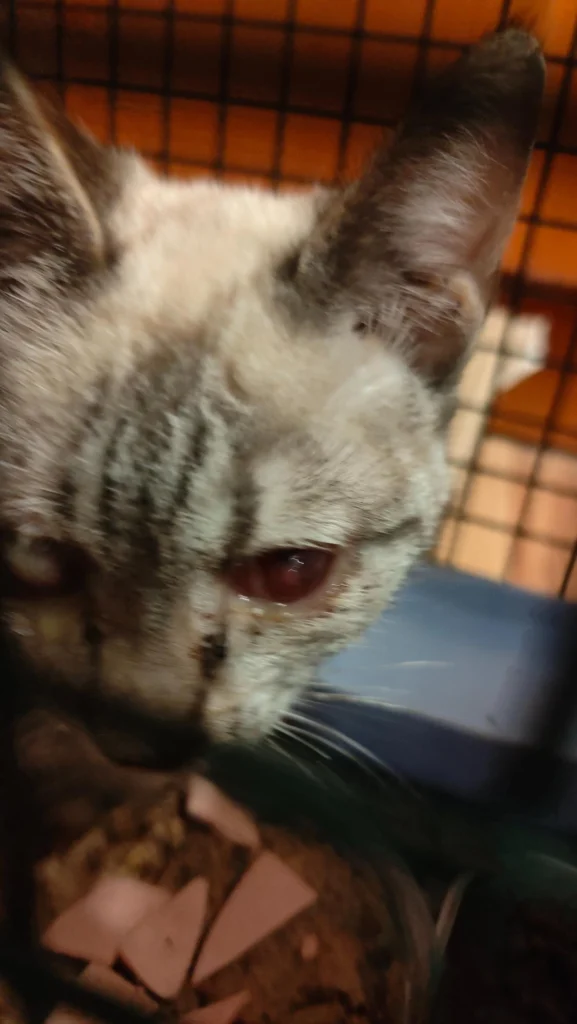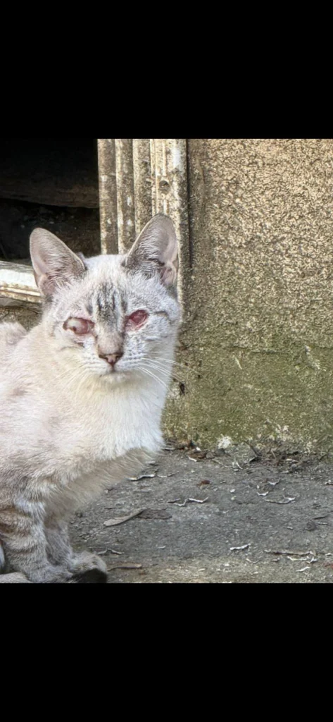 Update 15 martie 2026: ambele surori au fost prinse si duse la cabinet, sa vedem ce se poate face pentru pisica alba, daca i se mai poate salva un ochi